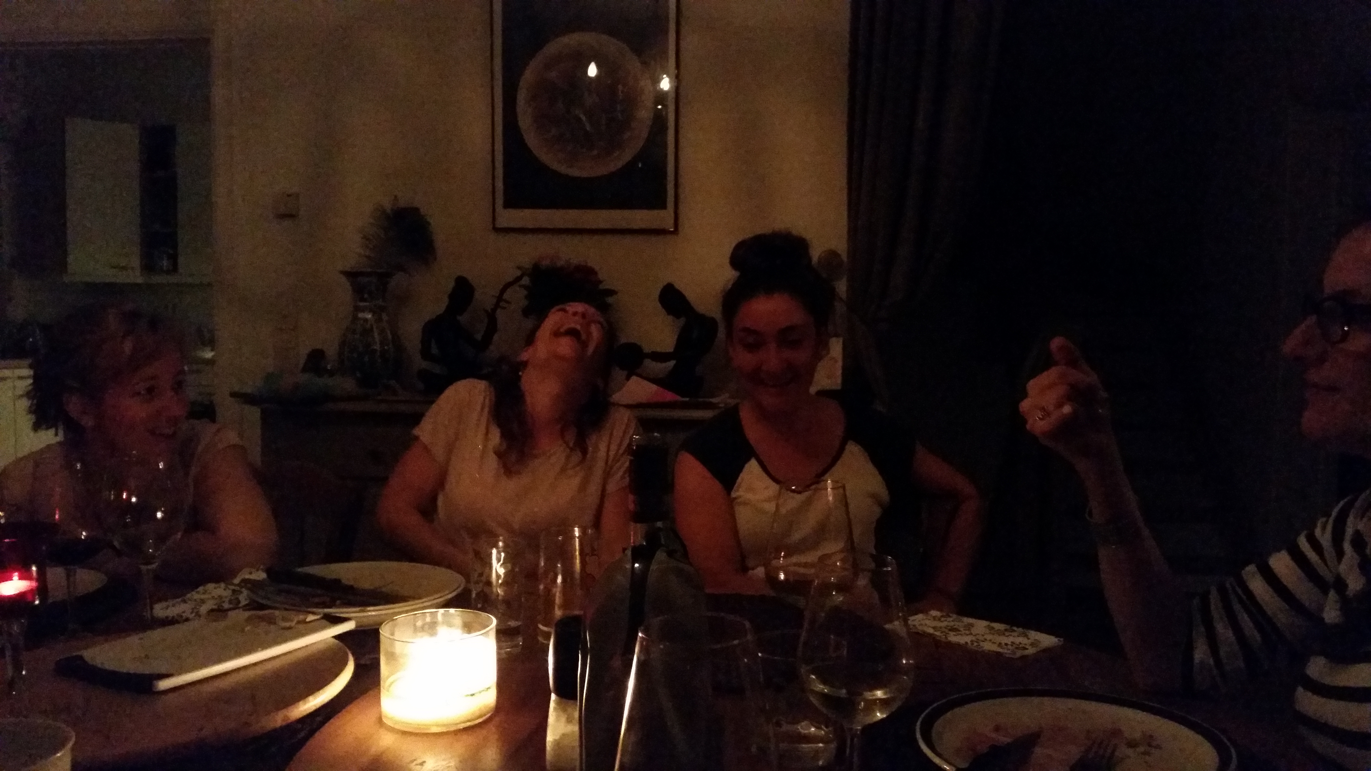 Les filles ont préparé l’apéro, les gars font le souper. Steak, petites fèves et carottes, SUPER bon!! On se met à table, il est environ 21h00. Durant le souper, on remarque que Maude est disons quelque distraite par quelque chose qui se passe de l’autre côté de la rue. Elle remarque qu’un gars, en « chest », danse dans sa cuisine pendant qu’il prépare à souper. Ça n’en prend pas plus pour que les quatre filles s’assoient « du bon côté » de la table pour ne rien manquer du spectacle. Vous remarquerez sur la photo que seulement deux regardent vers la fenêtre, les deux autres ont vu que j’allais prendre une photo. Bref, plus moyen de parler, les filles ont droit à leur « show » privé…